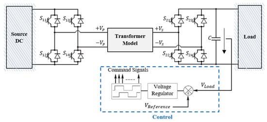 Based on the HFT modeling exposed above, it is possible to model the converter under study. Figure 7 represents the simplified power and control scheme, consisting of a Type D SST (see Figure 1), the only one between the two DC buses, that are the target of this study.