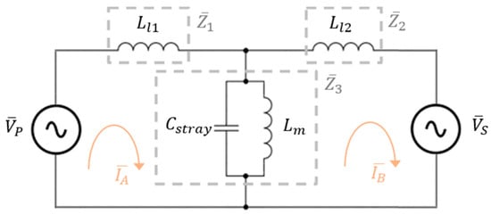 Based on the simplified equivalent circuit of the HFT, represented in Figure 9, where and represent the voltage at the primary and secondary terminals, respectively, performing the mesh analysis and after algebraic simplification, it is possible to obtain Equation (32).