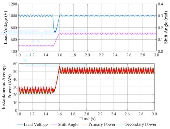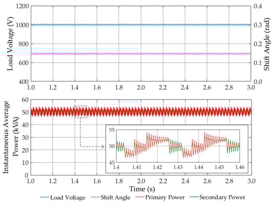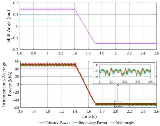 The shift angle is only applied to the bridge on the secondary side of the HFT, operating the bridge on the primary side of the HFT with a zero angle. When the power flow switches from the forward to the reverse direction, the phase shift angle will have to take on a negative value, as verified in Figure 13.