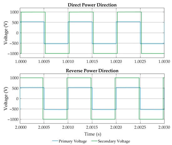 The impact of the variation of the shift phase angle can also be seen in Figure 14, where the temporal evolution of the voltage at the HFT terminals is represented. When the power flow is in the forward direction, the secondary voltage leads the primary voltage. On the contrary, when the power flow is in the opposite direction, it is verified that the secondary voltage is laggs the primary voltage.
