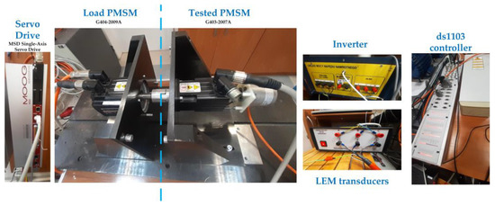 Experimental tests were carried out on a 0.894 kW PMSM motor from Moog (G403-2007A). The dSpace DS1103 rapid prototyping system with Control Desk and Matlab/Simulink software was used in the tests, the position of the shaft was measured with an incremental encoder (36,000 imp./rev), and the current measurement was carried out using LEM-type current transducers. Another Moog PMSM motor (G404-2009A—0.89 kW) controlled by a Moog servo drive was used as the load. The parameters of the motor are presented in