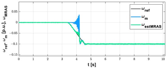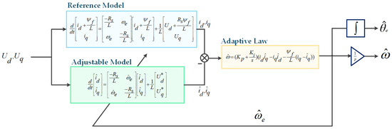 The first system used for speed estimation is the model reference adaptive system (MRAS). This type of estimator consists of three basic elements: reference model, adjustable model, and adaptive law. The difference between the value obtained from the reference model and the adjustable model is processed by the adaption law. Subsequently obtained signal can adjust the adjustable model parameters and strive to obtain the same value as the value from the reference model. MRAS used in the article is based on the PMSM model in the