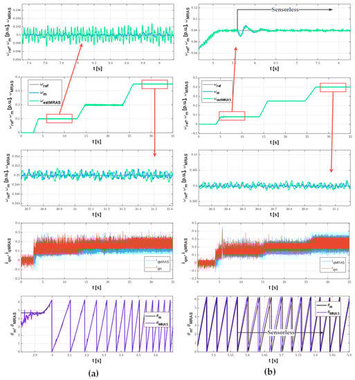 Transients of speed, current in q axis, and rotor position measured and estimated by MRAS in sensor (a) and sensorless (b) mode.