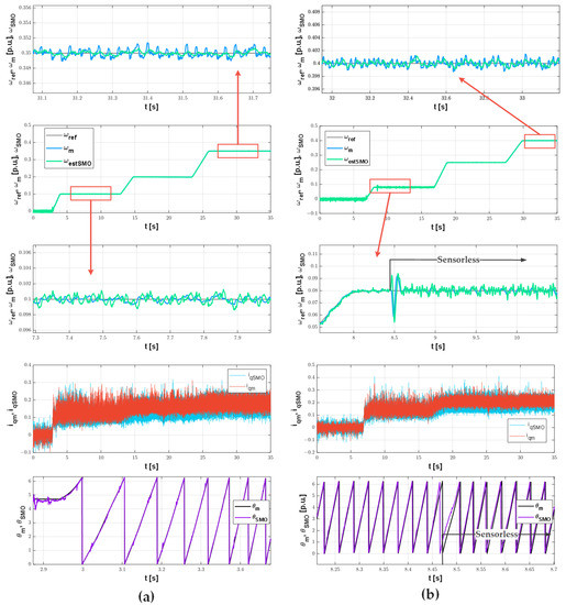 Transients of speed, current in q axis, and rotor position measured and estimated by SMO in sensor (a) and sensorless (b) mode.