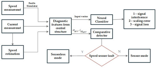 14]. The detection is based on measured and estimated signals. However, this solution is presented for an induction motor, with only simulation results. The obtained results show that the detection of damage to the speed sensor using a neural network allows for high efficiency.