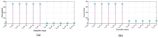 Correlation values between input vector elements and output vector in classifier based on MRAS (a) and SMO (b).