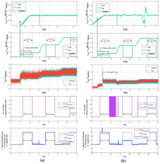 Speed, MRAS detector, and neural classifier transients during signal loss without motor load (a) and with motor load 0.15TN (b).