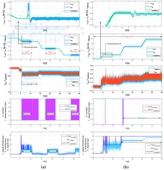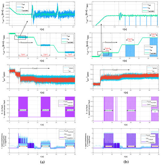 Figure 15), both the detector and the classifier almost do not make errors. The load also slightly affects the efficiency of the system. In this case, too, the increase in speed improves the performance of the system. This is especially important for the SMO-based classifier because the version used in the article does not work correctly for the lowest speeds. Motor start in sensorless mode, unlike MRAS, is impossible as it requires additional systems. Signal interferences are detected with high efficiency, while the quick detection of cyclic signal losses shows the dynamics of the detector’s operation (