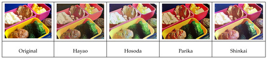 To generate webtoon images using the treatment as input for text-to-image generation models, the model must be trained on both the treatment and webtoon datasets. As constructing a large-scale dataset consisting of actual treatments and webtoons is challenging, the benchmark dataset commonly used in generative models, the MSCOCO dataset, was transformed into cartoons using a pre-trained CartoonGAN [26]. The MSCOCO dataset is a description photo dataset released by Microsoft (Washington, DC, USA) that consists of 123,287 training and validation images, each accompanied by five descriptions [27]. The officially provided dataset includes only English; therefore, the Korean MSCOCO dataset, which was translated from the MSCOCO dataset by the AI hub in Korea, was additionally used to construct a multilingual treatment dataset [28]. The Korean MSCOCO dataset also consisted of five Korean descriptions per image, resulting in ten sentences per image: five in English and five in Korean. The pre-trained CartoonGAN was trained in four styles, as shown in Figure 1. Thus, 1,232,870 treatment webtoon data pairs were constructed for each style, thereby resulting in 4,931,480 data pairs for all four styles.