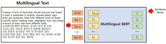Sentence vector extraction using Multilingual BERT. The sentence on the left side of the figure is a sentence written in Korean with the same meaning as the English.
