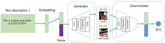 The text-to-image loss function using the DCGAN is given by Equation (1), where G represents the generator function, D represents the discriminator function, x is the input vector, z is the random vector, and φ(t) represents the feature vector of the input text. The discriminator is trained to have a larger value for Equation (1) to distinguish between real and fake data, whereas the generator is trained to have a smaller value for Equation (1) to generate fake data similar to the real data. The discriminator of the DCGAN used in this study receives three types of data as inputs and is trained to classify real image-right text as real, real image-wrong text as fake, and fake image-real text as fake. To prevent overfitting, label smoothing and feature matching were used in the experiments. The loss function is as follows: