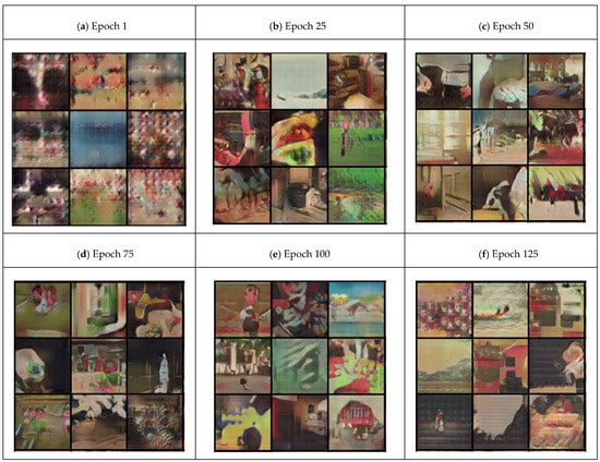 Figure 4 shows the images generated by the generator when the validation data text was input as the number of training epochs increased. As shown in Figure 4a, when the number of training epochs was one, the generated images were vague. As the training progressed, the generator began drawing the shape of the objects, as shown in Figure 4e, for up to 100 epochs. However, the generator could not generate further images after a certain point. Therefore, our experiments suggest that the model trained for 75 epochs is suitable for the webtoon dataset constructed in this study, based on the loss of the generator and discriminator as well as the image output using the validation data.
