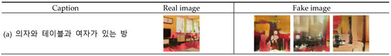 Figure 5, Figure 6 and Figure 7 show the images generated by inputting the test data into the generator model trained for 75 epochs. Figure 5 and Figure 6 show the webtoons generated when Korean and English treatments were input, respectively, and Figure 7 shows the webtoons generated when treatments with the same meaning in Korean and English were input. Evidently, although the similarity with the original images was not high, the generator was still able to produce some shapes that were expressed in the text. When analyzing objects, the experimental results suggest that the generator does not express objects such as humans and animals well but does express objects such as chairs relatively well. Figure 7 shows the images generated by inputting the same meaning of Korean, English, Japanese, and Chinese into the DCGAN trained in this research. Although the generated webtoons may be different from each other, the semantic shapes of the words expressed in the treatments are similarly represented. Similar to the previous experiments, it can be observed that the generator is drawing shapes related to the keywords in the sentences.