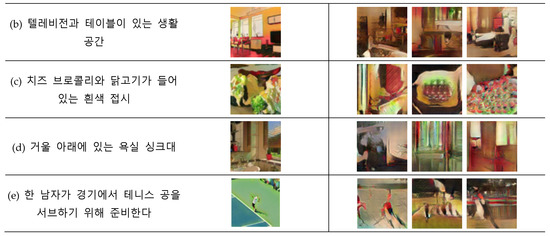 In this section, a webtoon dataset for training a multilingual text-to-image model is constructed using a benchmark dataset. To create a multilingual webtoon dataset, the MSCOCO dataset released by Microsoft and the Korean MSCOCO dataset translated and released by the AI Hub were used, and CartoonGAN was used to transform them into cartoons, as mentioned in Section 3.1. The original MSCOCO dataset consists of 82,783 training images and 40,504 validation images, each containing five English descriptions. The Korean MSCOCO dataset was added to create 1,232,870 pairs of multilingual webtoon data, with each image containing ten descriptions (five in English and five in Korean). CartoonGAN can transform images into four different styles; therefore, a total of 1,232,870 pairs of webtoon data were constructed by pairing one image with one treatment. Table 1 shows examples of multilingual treatment webtoon datasets.