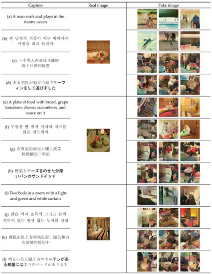 Table 2 summarizes the proposed multilingual text-to-image model on the test dataset in terms of the inception and Frechet inception distance (FID) scores. For the evaluation measurements, a total of 1,620,160 images were used, with four images per text. The inception score evaluates the quality and diversity of the generated images, whereas the FID score compares the mean and covariance values of the feature values of the real and generated images. The inception and FID scores for the multilingual text-to-image model were 4.992 and 22.212, respectively. The inception score of the DCGAN model trained on the MSCOCO dataset was 7.88 [4]. A lower inception score of the DCGAN model trained on the multilingual webtoon dataset was expected because of the distortion of the represented shapes in the images during the cartoonization process.