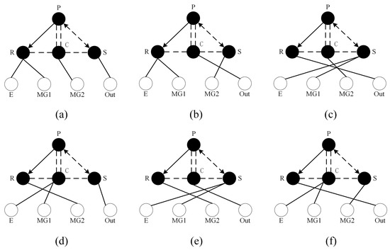 A single row of a star row in one of the nodes in this study can only be connected to two power components simultaneously, and the power components include the motor, the engine, and the output shaft, when designing the configuration scheme. The selection process begins from the perspective of the connecting nodes and considers that the design configuration must achieve variable speed adjustment. Figure 2 illustrates an input split arrangement with six connection options when the motor and output are linked at the same node.