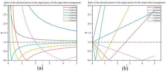 (a) Ratio of the electrical power to the engine power for the input; (b) ratio of the electrical power to the engine power for the output split arrangement.