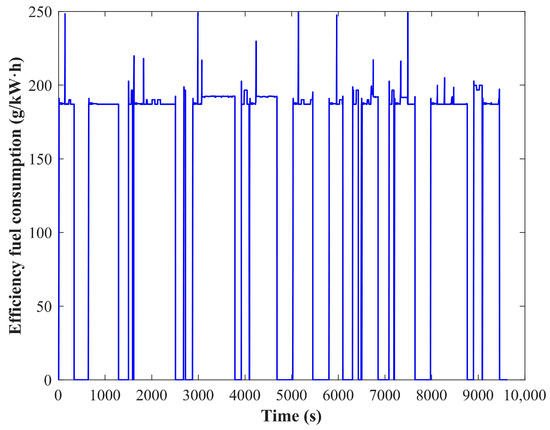 Figure 9 shows that the effective fuel consumption rate of the designed hybrid train is less than 200 g/kWh during operation, which is consistent with the engine operating point distribution in Figure 8b.