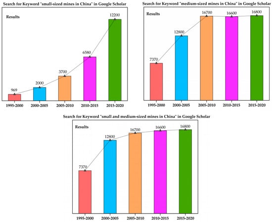Changes in the number of literature related to “Small-sized mines in China”, “Medium-sized mines in China” and “Small and medium-sized mines in China” from 1995 to 2020.