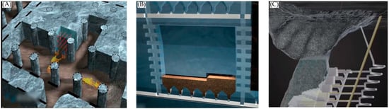 A significant number of SM mines in China still rely on the room-and-pillar method for ore mining. As illustrated in Figure 2A, the room-and-pillar method involves leaving pillars to support the roof, and its simplicity and applicability to horizontal or gently inclined stratified ore bodies make it popular in SM mines [12]. However, the method’s drawbacks are evident: it results in ore loss due to the placement of pillars to support the roof, significantly reducing the recovery efficiency of the ore and having a negative impact on the economic efficiency of SM mines [13].