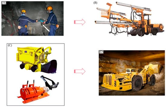 (A) Pneumatic rock drill; (B) Rock drill cart; (C) Electric rake and rock loader; (D) LHD.