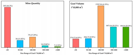 Goaf collapses can cause severe environmental problems, such as surface collapse, which not only impacts the ecological and geological environment but also greatly affects the development of the local mining economy [25]. For SM mines, managing and maintaining the mining area is more challenging and can result in serious safety hazards, such as cave-ins [26]. According to available statistics, there are more than 100 mines in China with a goaf area of 1 million cubic meters or more, and the accumulated mining goaf volume is up to 356 million cubic meters, as shown in Table 3 and Figure 5.