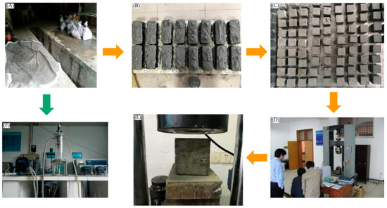 Shishudi Gold Mine backfill experiments: (A) Tailings sampling; (B) Test blocks making; (C) Test blocks finishing; (D) Compression testing equipment; (E) Compression test; (F) Simulation experiment: deep-cone thickener.