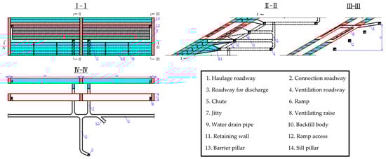 Therefore, SM mines need to choose the appropriate backfill mining method according to the actual situation of their mine, which can greatly improve mining efficiency while ensuring the safety of mining production. For instance, at the Shishudi Gold Mine in Henan, China, the upward horizontal cut and backfill stoping method (as shown in Figure 8) is used, which can significantly increase ore recovery while ensuring safety.