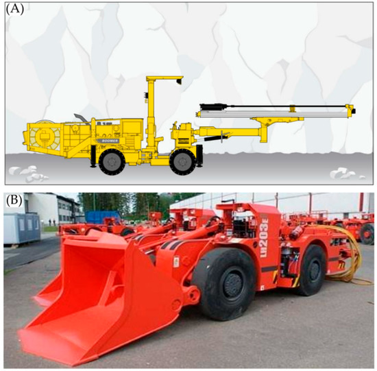 Shishudi Gold Mine: (A) Hydraulic rock drilling trolley, type: Boomer K41; (B) LHD.