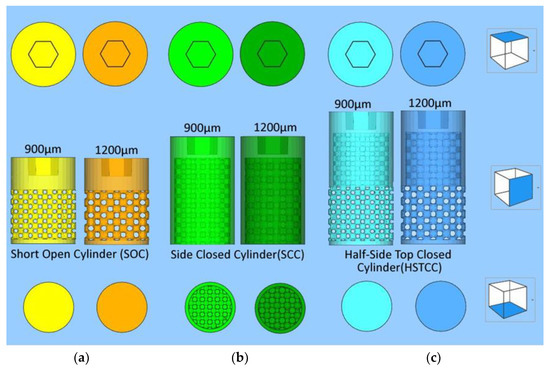 - Half-side-closed cylinder: 10.4 mm of lattice for 12.4 mm in total. The top and bottom of the cylinder are closed by dense surfaces. In this way, the bone penetration is half peripherally limited (Figure 1c);