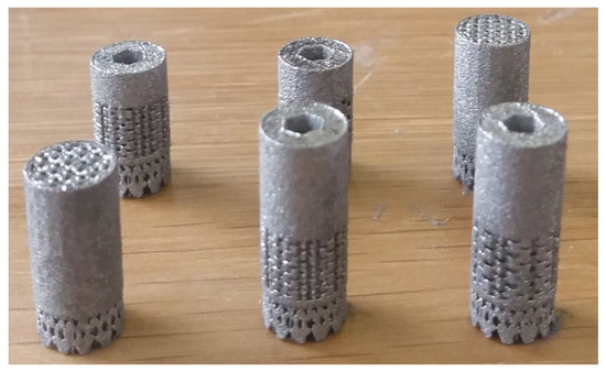 The implants (Figure 2) were additively manufactured with a laser beam powder bed fusion (PBF-LB) process by Z3Dlab using the patented titanium alloy Ti–19Nb–14Zr (at %), hereinafter ZTM14N [7]. The pre-alloyed powder of Ti–19Nb–14Zr (at %) was produced using powder atomization to obtain a spherical-shaped powder. An SLM 125HL (SLM solution) PBF-LB machine equipped with a 200 W ytterbium fiber laser was employed. The layer thickness was chosen to be 30 µm, and the temperature of the building platform was kept constant at 200 °C to minimize residual stresses.
