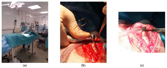 The surgical operations (Figure 3a) enabling the placement and removal of the implants into and from the sheep were approved by the French Ministry of Research after ethical evaluation by the facility’s Ethical Committee. These operations were performed by a surgeon assisted by a technician at the Biomedical Research Center of the National Veterinary School of Alfort in France (Centre de Recherche BioMédicale (CRBM) de l’Ecole Nationale Vétérinaire d’Alfort). The center has a dedicated operating room for both large and small animals. Prior to the operation, the sheep underwent a complete veterinary examination and then anesthesia. The anesthetic and analgesic protocol performed by an anesthetist implied the following steps:
