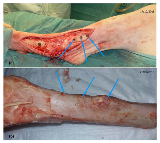 The euthanasia of the sheep after twelve weeks was performed by pre-medication by intravenous injection of a mixture of ketamine (6 mg/kg) and diazepam (0.5 mg/kg), followed by an injection IV of 20 mL of pentobarbital 18%. For the removal of the implants, the surgical site was taken over by the same approach as the placement surgery. A visual inspection of this surgical site was carried out and compared to the site after the implants’ placement (Figure 4). Then, the bone parts including the cylindrical specimens were sliced and immediately frozen at −18 °C. Finally, the parts were transferred in dry ice to BAM in Berlin, where they were kept frozen at −18 °C before the XCT characterizations.