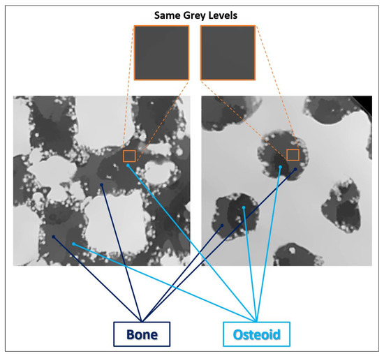 Bone and osteoid tissue sharing the exact same XCT gray levels at different locations within the same dataset due to beam hardening.
