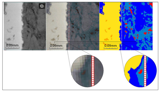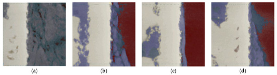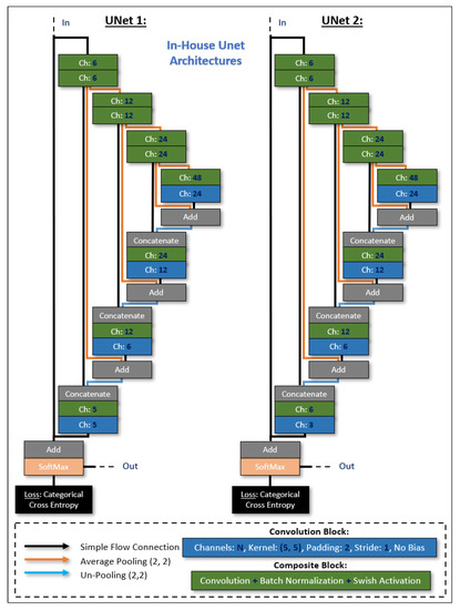 The UNet architectures (shown in Figure 8) were designed and trained with Sony’s Neural Network libraries [19] on a workstation equipped with a GeForce RTX 3090 graphics card (Nvidia, Santa Clara, CA, USA), an Intel i7 CPU (Intel, Santa Clara, CA, USA), and 32 GB of memory. The ADAM optimizer [20] was selected as the training algorithm (parameters: initial learning rate/alpha = 10−4, beta1 = 0.9, beta2 = 0.999, updated every iteration), with an input batch size of 8, and random shuffling for the training dataset on each epoch. The learning rate was updated exponentially on every epoch with a learning rate multiplier LRM = 0.95, and we trained for a total of 300 epochs with Categorical Entropy Loss. The decisive (learnable/trainable) parameters within the UNet architectures were adopted from the epoch that minimized the validation error. Based on the reserved testing image, we report a global accuracy Dice score of 85%.
