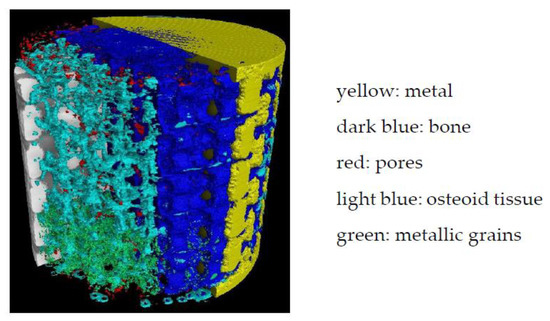 Additive manufacturing (AM) enables the manufacture of very complex shapes and alloys [1,2]. More specifically, the laser-based powder bed fusion process [3,4,5], due to its implementation of small grain size powder (15–45 µm) allowing small and thin structures to be manufactured, enables the fabrication of lattice structures. Such structures are likely to promote bone growth in implantology. This bodes for the stability of the implant, which is a very interesting aspect for the medical sector. Indeed, better and faster osseointegration of the implant into the human body allows the patient to recover faster. In a previous article [6], we already demonstrated “in vivo” that the lattice promotes osseointegration by implementing the titanium alloy Ti6Al4V grade 23 containing aluminum (Al) and vanadium (V), already widely used for dental and hip implants. This study concerned mainly the conformity of the implants to their computer-aided design (CAD) and the powder particle adhesion to the lattices, and investigated the osseointegration as a function of the shape and size of the lattice cells. The bone formation was only qualitatively studied by visual observations on X-ray computed tomography (XCT) images of the implants placed in a sheep for eight weeks. A stop of the bone growth was observed at 3 mm from the border in the lattice of 1200 µm cell size after 8 weeks, in the Ti6Al4V alloy.