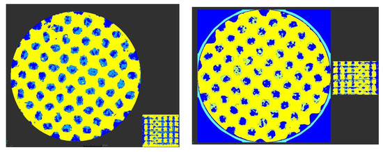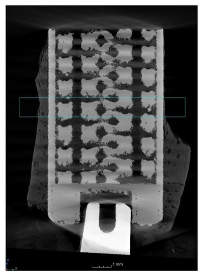 In the present study, BICs with the side-closed cylinder open at its bottom were evaluated (8 mm of lattice for 10 mm in total) (Figure 1b). The measurements were performed on 1 mm high sagittal sections (see blue rectangle in Figure 10) corresponding to 150 pixels of 6.8 µm (Figure 11).