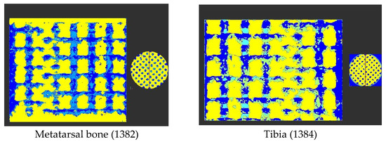 First of all, the bone progression was examined as a function of the location of the implants in the sheep’s body, i.e., the bone progression in the metatarsal bone was compared to that in the tibia (Figure 13). The percentages of bone (dark blue in Figure 13) and of osteoid tissue (light blue in Figure 13) within the lattice are, respectively, 20.5% and 8.8% for the metatarsal bone and 26.6% and 3.9% for the tibia for the same sheep. Therefore, it seems that the bone progression is more accentuated in the tibia than in the metatarsal bone. This result confirms that vascularization, one of the four processes that come into play in implant stabilization, is better in the tibia than in the metatarsal bone.