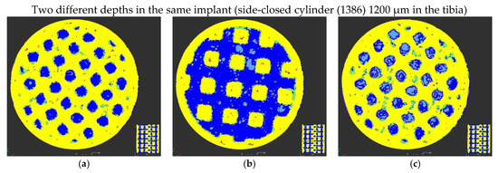 Bone progression in the three types of designs of the implants: (a) Side-open cylinder (1384) 900 µm in the tibia; (b) Half-side-closed cylinder (1385) 1200 µm in the tibia; (c) Side-closed cylinder (1386) 1200 µm in the tibia.