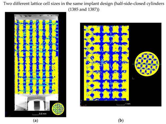 Bone progression for two different lattice cell sizes of the same implant design: (a) 900 µm (1387, meta); (b) 1200 µm (1385, tibia).