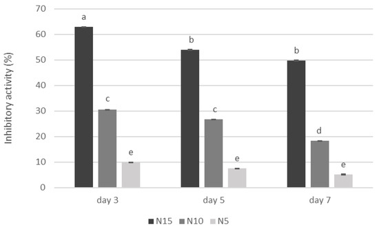 Effect of adding Calendula officinalis water extract on the mycelial growth of Aspergillus niger. N15, N10, N5—addition of Calendula officinalis water extract to the medium in doses of 15%, 10%, and 5% (v/v), respectively; Values marked with the same letters do not differ significantly at p < 0.05 (Tukey’s post hoc test); mean value (n = 3) ± SD.