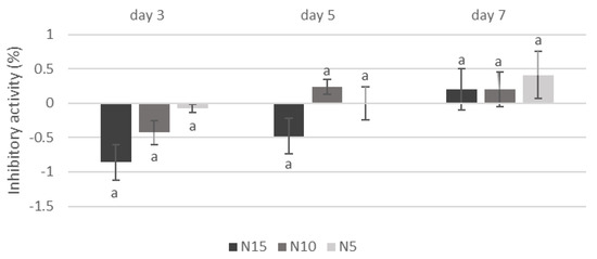 Effect of adding Calendula officinalis water extract on the mycelial growth of Penicillium sp. N15, N10, N5—addition of Calendula officinalis water extract to the medium in doses of 15%, 10%, and 5% (v/v), respectively; Negative values denote stimulation of fungal biomass production; Values marked with the same letters do not differ significantly at p < 0.05 (Tukey’s post hoc test); mean value (n = 3) ± SD.