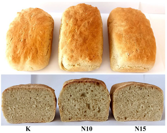 The appearance of control bread (K) and with the addition of Calendula officinalis water extract, 10% (N10) and 15% (N15), respectively.