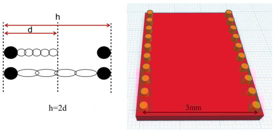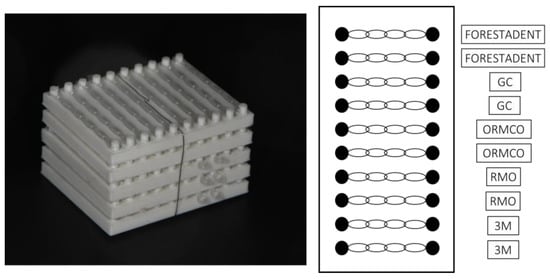 The study consisted of 5 different elastomeric orthodontic chains (EOC): Clear generation II Power chain (Ormco, Orange, CA, USA), GC Ortho chain (GC Europe, Leuven, Belgium), F. M. Ringlet Elastomeric chain (Rocky Mountain Orthodontics®, Franklin, TN, USA), Happy elastics spool chain (Forestadent, Pforzheim, Germany), and AlastiK Chain (3M Unitek, Monrovia, CA, USA). They were cut into 6 link segments (15 mm), which simulate the distance from canine to canine. The sample consisted of 100 elastomeric chain cuts, 20 of each manufacturer. In order to activate the samples to double the original length, individualized plates were designed on TinkerCad (Autodesk, San Francisco, CA, USA) and printed on a Renfert 3D printer (Renfert GmbH, Hilzingen, Germany) with SIMPLEX aligner model filaments (Φ 1.75 mm, printing temperature 235–255 °C, printing bed temperature 90 °C; Renfert GmbH, Hilzingen, Germany). The dimensions of the plates were 4 mm × 3.2 mm, with an intercylinder length of 3 mm, so elastomeric chains could be activated on double length (Figure 1). In total, 10 plates were printed for 10 chain samples each.
