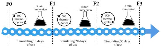 Study protocol. F0—initial force measurement, F1—force measurement after 500 thermocycles, F2—force measurement after 1000 thermocycles, F3—force measurement after 1500 thermocycles.