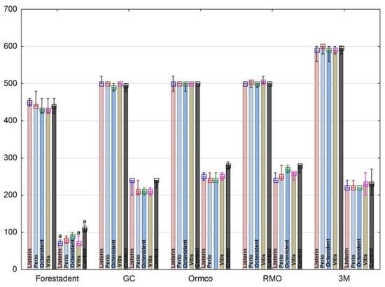 Table 2 presents descriptive statistics (median, upper, and lower quartiles) and an intergroup comparison of the cumulative percentage of EOC force decay in different oral antiseptics (OA). In all experimental groups, Forestadent showed a statistically significant higher percentage of force decay than Ormco and RMO, while in Octenident, 3M presented a higher drop rate over RMO (p = 0.049). On the other hand, all EOC groups submerged in different oral antiseptics did not significantly differ from the control group (EOC in distilled water), with the exception of Forestandent EOC in Listerine with a drop rate of 84% (83–85%) in comparison to the control group, 75% (73–77%).