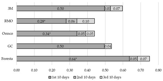 Effect of thermocycling on force decay in three points of 500 thermocycles simulating 10, 20, and 30 days of use. * indicates statistically intergroup (brand) heterogeneous data.