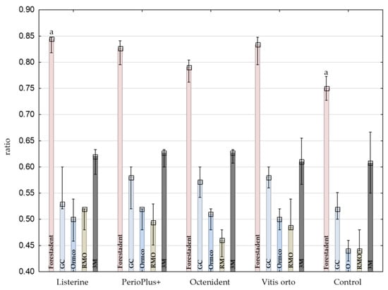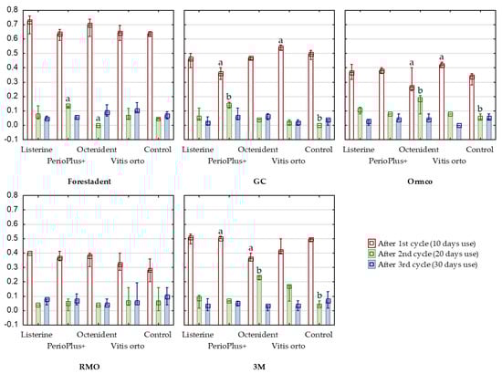 Force decay ratio after three phases/cycles simulating cumulative of 30 days use. Note: small letters indicate intergroup (oral antiseptic) statistically heterogeneous data.
