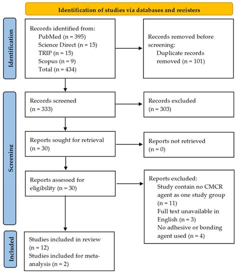 This systematic review’s protocol was registered under PROSPERO registration number CRD42021283259. This non-Cochrane in vitro systematic review followed the four-phase flow diagram based on the Preferred Reporting Items for Systematic Reviews and Meta-Analyses (PRISMA) Statement [28]. The following PICO components were established, as presented in Table 1.
