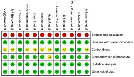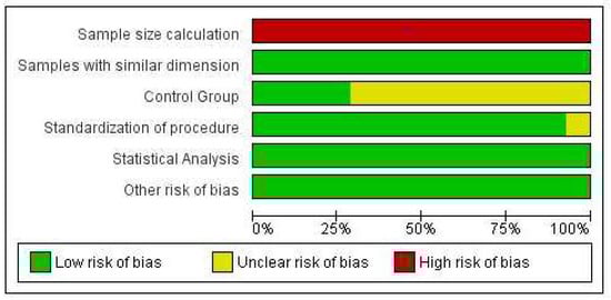 The risk of bias (ROB) in the included studies was independently determined by two review authors (P.M. and L.M.). A modified CONSORT checklist of items for reporting in vitro studies of dental materials [29] was used to assess ROB. For each study, the following domains were considered: sample size calculation, samples with similar dimensions, control group, standardization of procedure, statistical analysis, and other risks of bias.